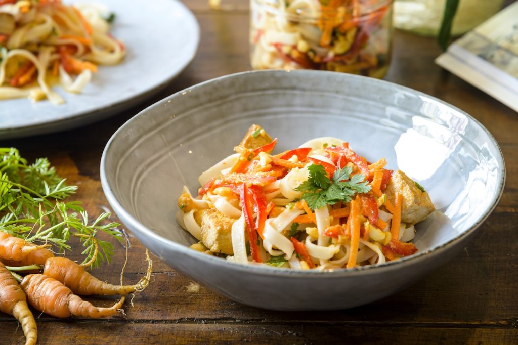 Noodles de Arroz, Tofu (Soja), Cenoura, Óleo de Girassol, Lima, Tamari (Soja), Gengibre, Alho, Mel e Malagueta, Limão, Pimento Vermelho, Amendoim, Miso (Soja), Cebolinho Fresco e Coentros