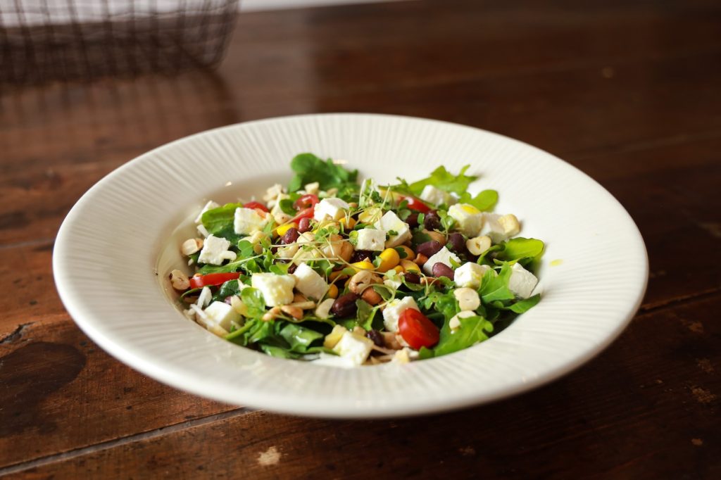 Feijão Azuki, Grão de Bico, Nabo, Feta (Leite), Tomate, Milho, Rúcula, Cebola, Azeite, Mostarda, Vinagre, Salsa, Alcaparras, Sal, Pimenta e Cajú