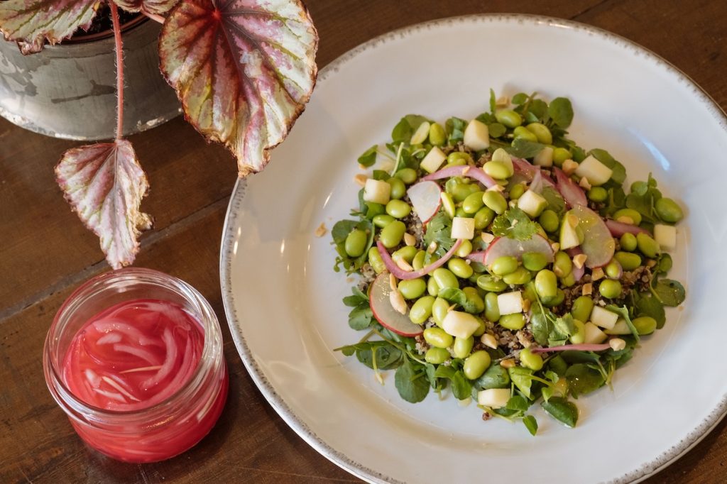 Quinoa, Edamame (Soja), Agrião, Maçã, Cebola Roxa, Azeite, Vinagre Tinto, Molho de Soja, Mel, Óleo de Sésamo, Coentros, Rabanete, Amendoim e Sal.