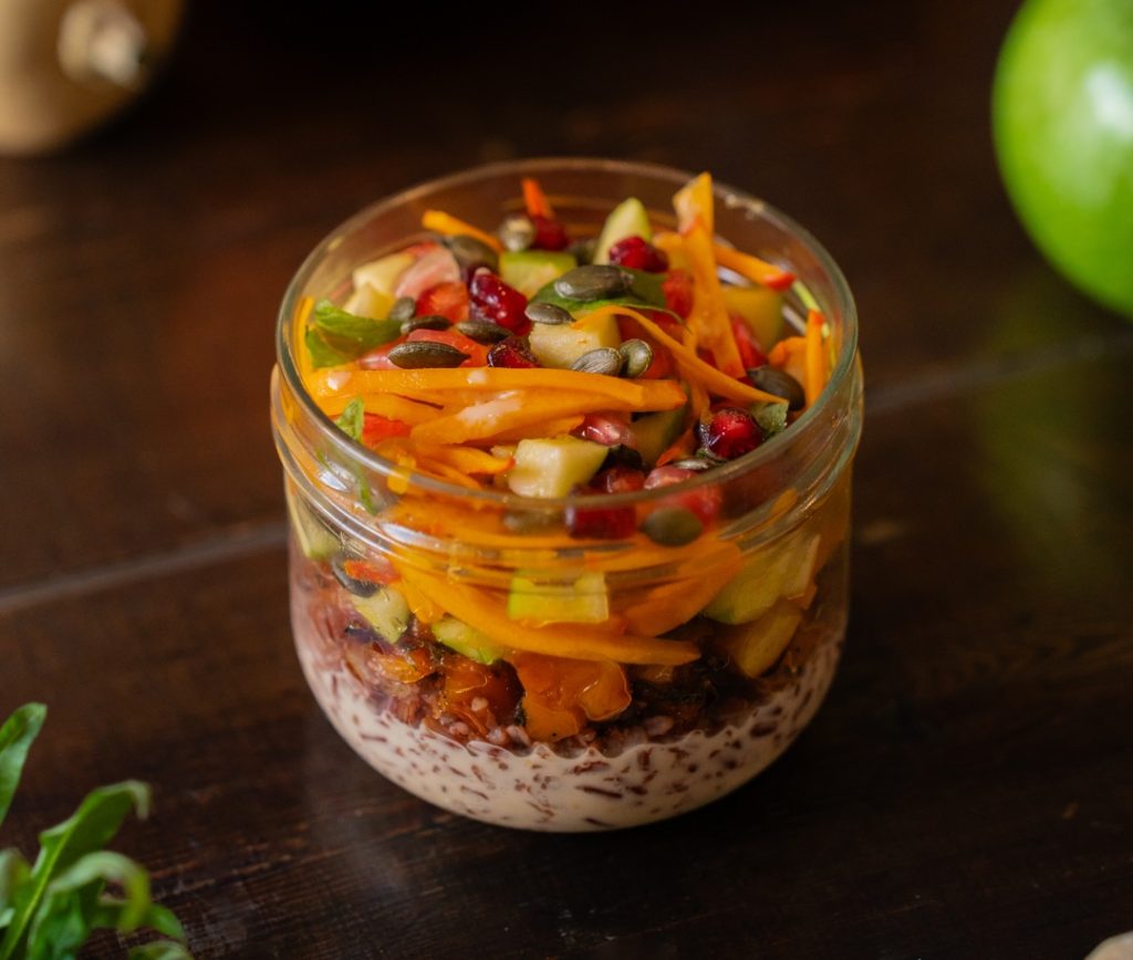 Arroz vermelho, Abóbora manteiga, Azeite, Maçã, Hokkaido 6%, Feta, Romã, Maple syrup, Limão, Sementes abóbora tostadas, Água de rosas, Sal, Vinagre maçã, Hortelã, Gengibre, Salvia.