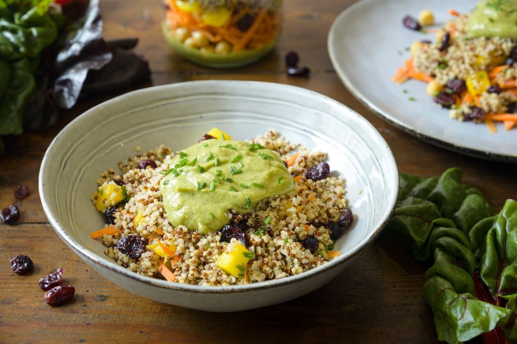 Grão de Bico, Quinoa, Manga, Cenoura, Sultanas (Sulfitos), Abacate, Azeite, Coentros, Limão, Sal, Cebolinho Fresco e Alga Kombu