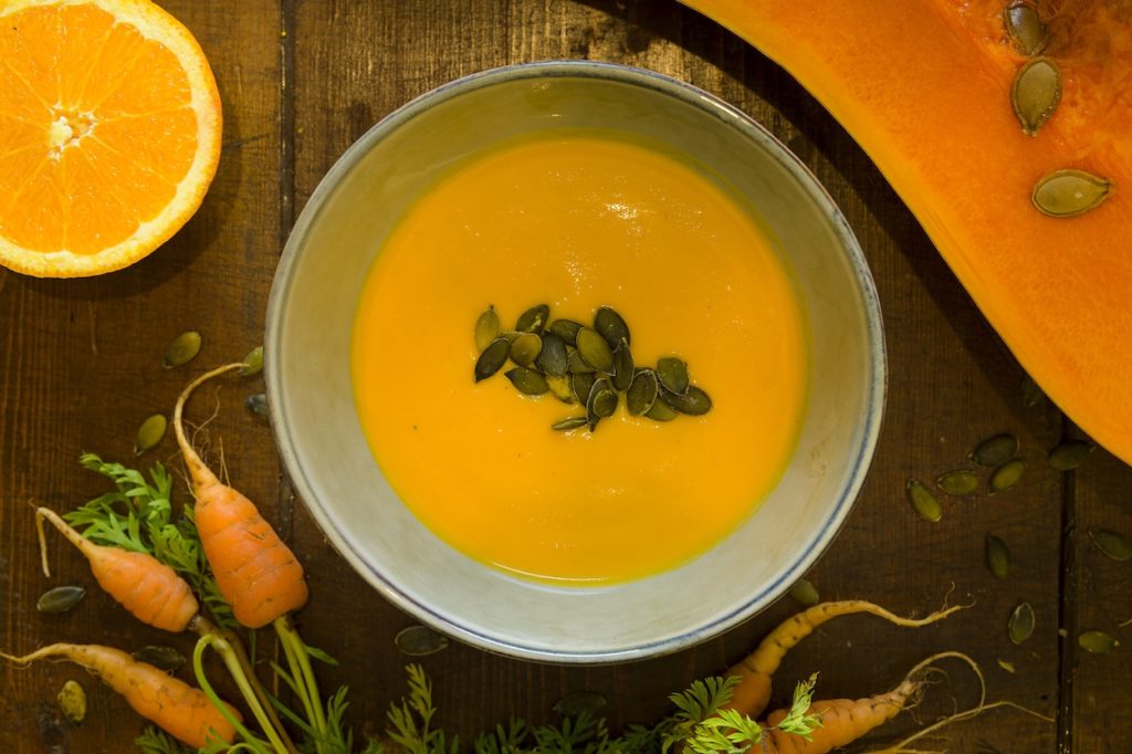 Abóbora 42,5%, Bebida de Aveia, Cenoura, Cebola, Laranja 5%, Azeite, Sal, Ghee, Alho, Gengibre e Pimenta Preta