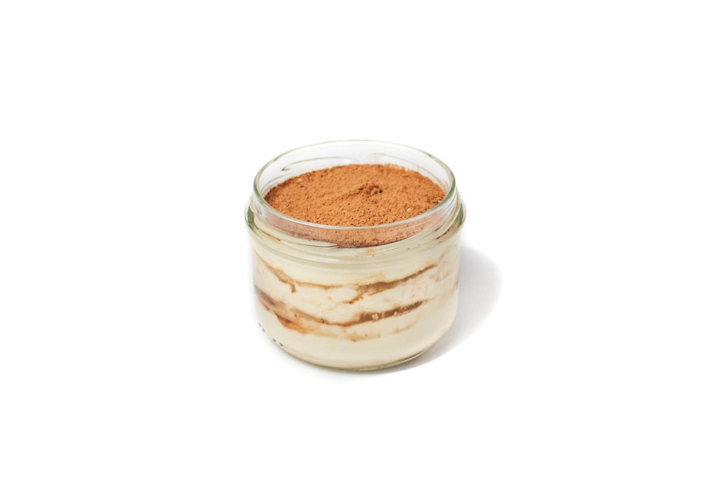 Mascarpone (Natas, Leite, regulador de acidez: ácido citrico), Ovos, Agave, Biscoito (farinha de trigo), Café, Agave e Cacau