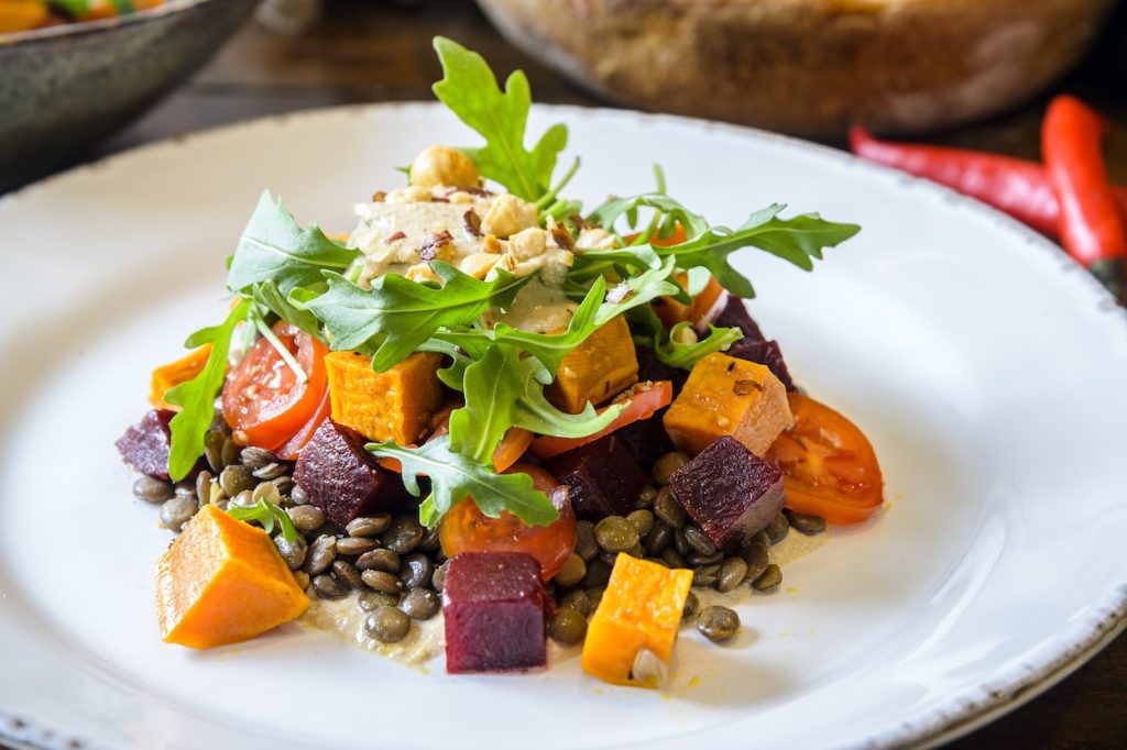 Beterraba, Lentilhas, Batata Doce, Tomate Cherry, Sementes de Sésamo, Limão, Gengibre, Azeite, Mel, Alho, Sal, Rúcula e Avelã