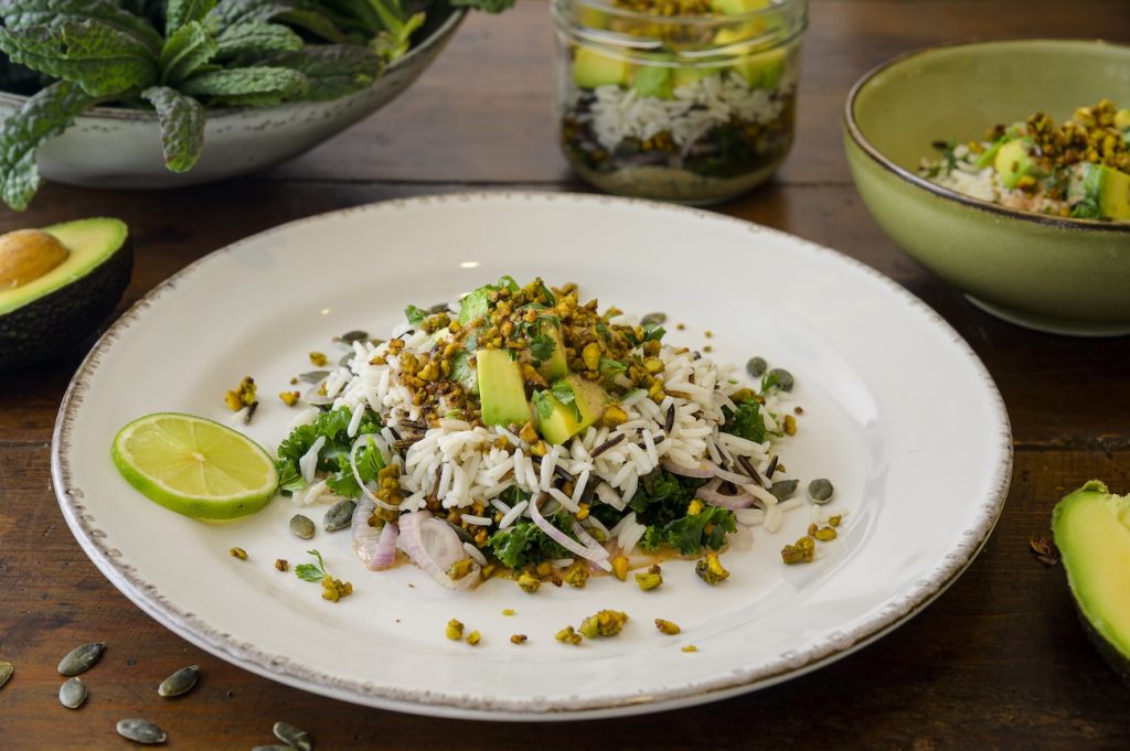 Arroz Selvagem 35%, Abacate 21%, Kale 13%, Sementes de Abóbora, Chalota, Limão, Amêndoa, Pistachio, Gengibre, Azeite, Mel, Sal, Coentros, Geleia de Agave e Malagueta