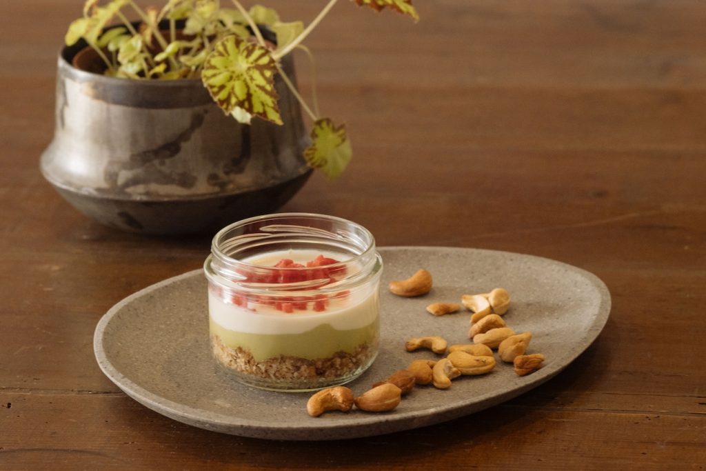Caju, Mascarpone (Natas, Leite, regulador de acidez: ácido citrico), Geleia de Agave, Tâmara, Amêndoa, Tahini, Côco, Óleo de Côco, Limão, Matcha 0,1% , Framboesas e sal.
